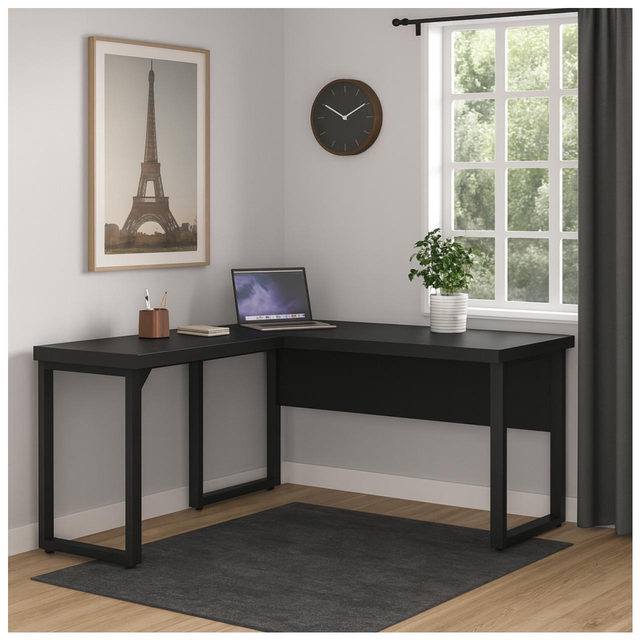 Mesa em L PÉ QUADRO (1,50×0,60m+ Mesa Auxiliar) – S/ Gavetas – PRETO / PRETO – 26010